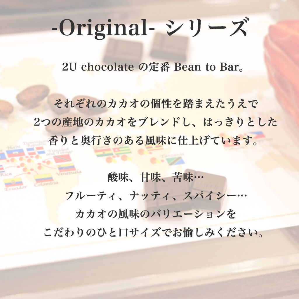 2U chocolate では「カカオの個性を皆さまにお楽しみいただく」ことをポイントに Bean to Bar チョコレートの製造を行っております。